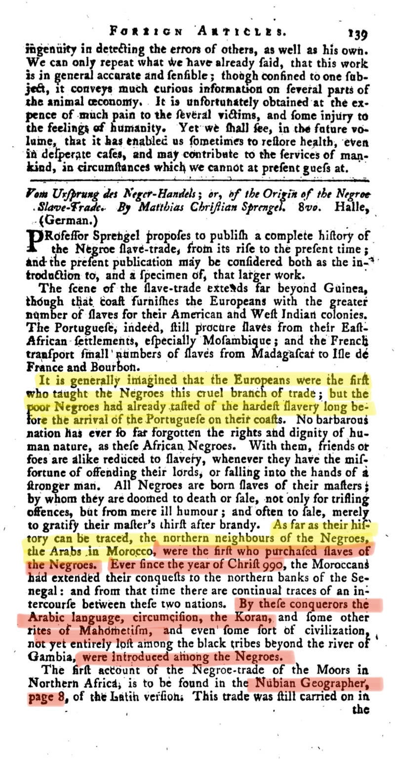 By These CONQUERORS the ARABIC LANGUAGE, circumcision, THE QURAN and other rites of ISLAM, and even some sort of civilization-not yet entirely lost among black tribes beyond the river of Gambia, were INTRODUCED among the negroes”